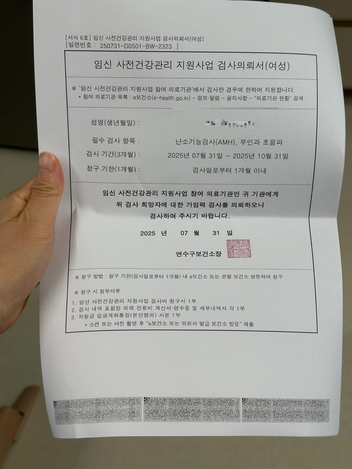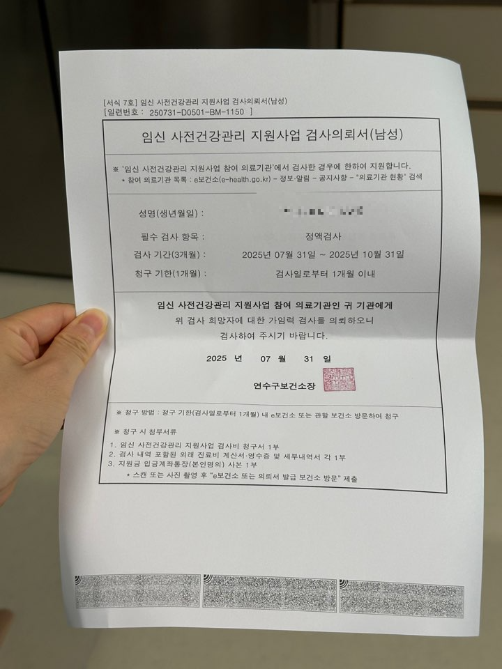 - 검사 후 1개월 이내 보건소에 서류 제출하여 비용 청구